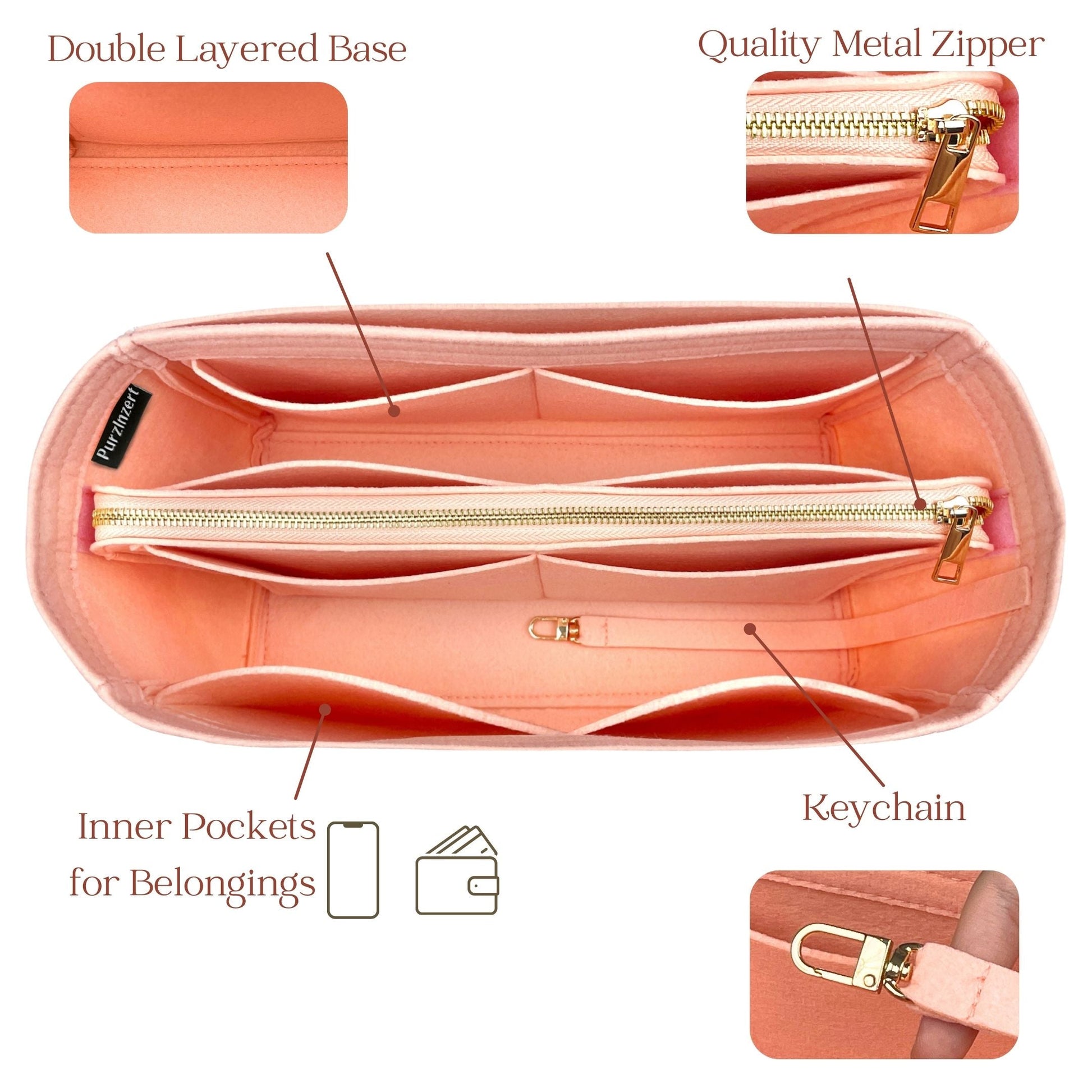 You will receive the organizer just as shown in the picture. Want more options? You can add extras like a base shaper, zipper cover, laptop pocket, bottle compartment, key clasp, or handles when ordering. This premium bag insert provides strong support and reliable protection without extra weight. The durable, color-safe material keeps your bag interior clean and well-structured.