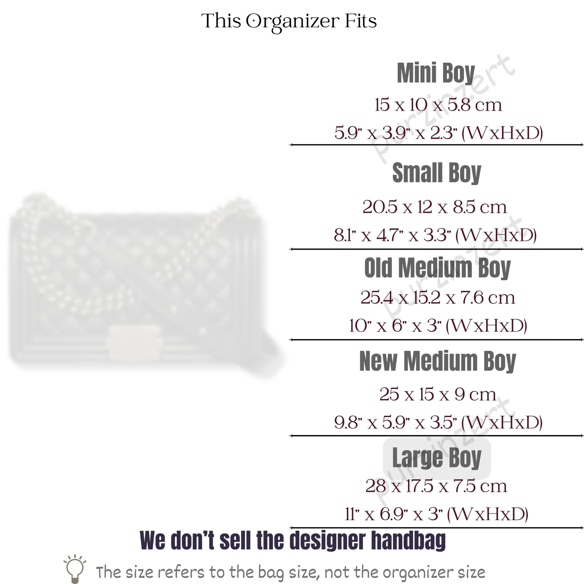 We also offer made-to-order organizers. To get one tailored for you - simply leave a note in the customization box with your bag name - interior base size - and preferred height. Our team will create an exact fit.