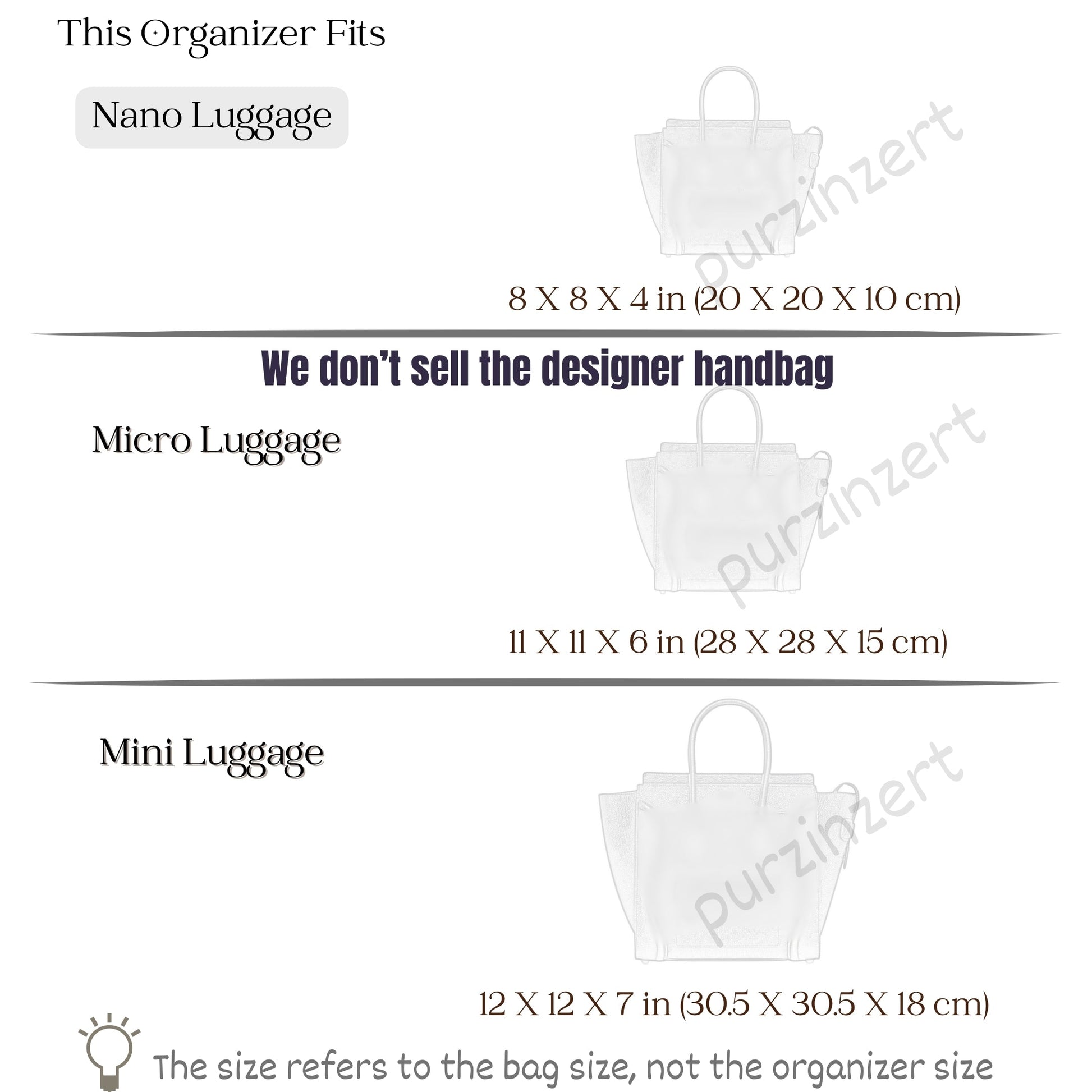 We also offer made-to-order organizers. To get one tailored for you - simply leave a note in the customization box with your bag name - interior base size - and preferred height. Our team will create an exact fit.